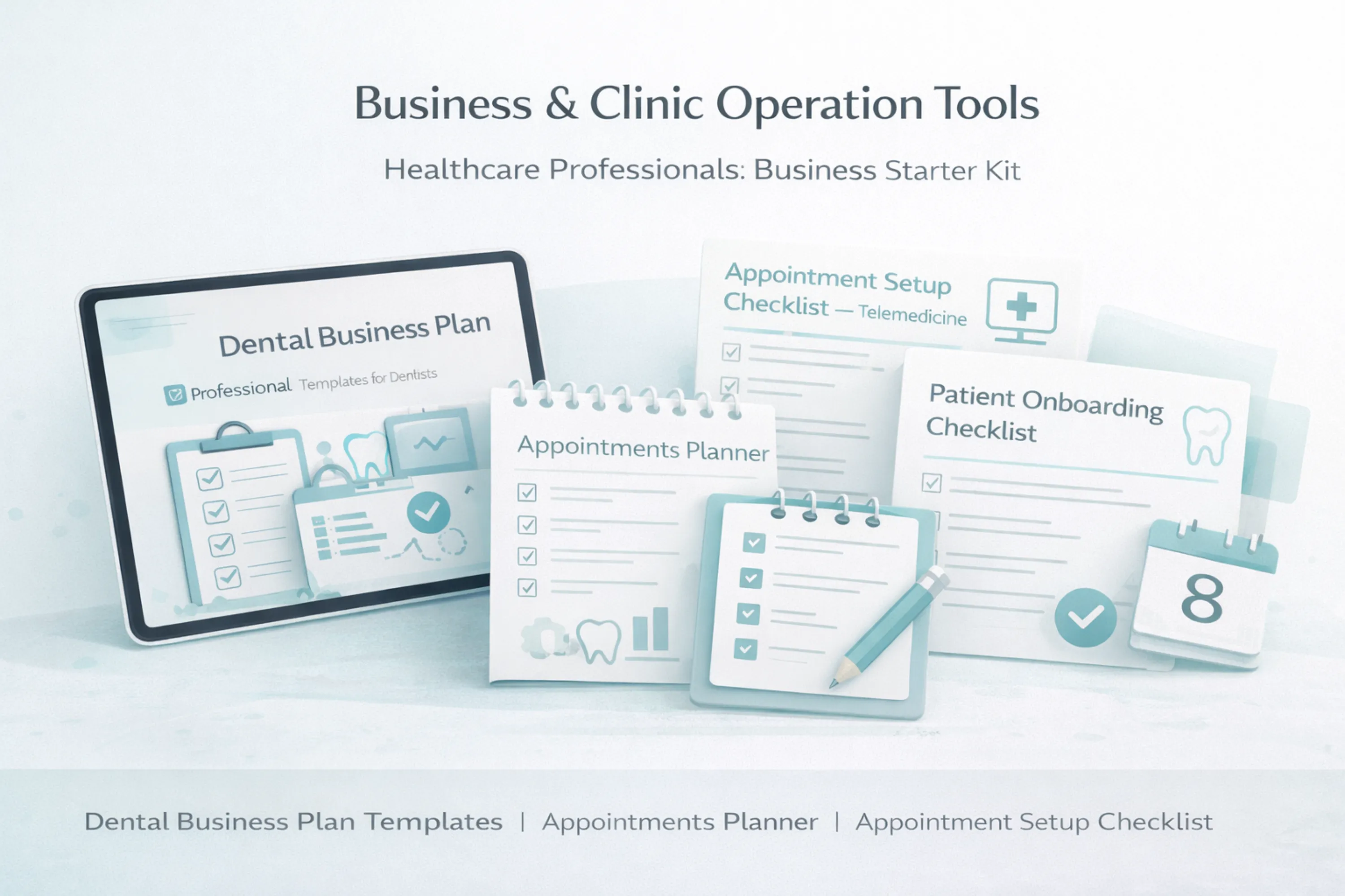 Essential business and clinic operation tools including dental business plan templates, healthcare professional business starter kit, appointment planners, and patient onboarding checklists.